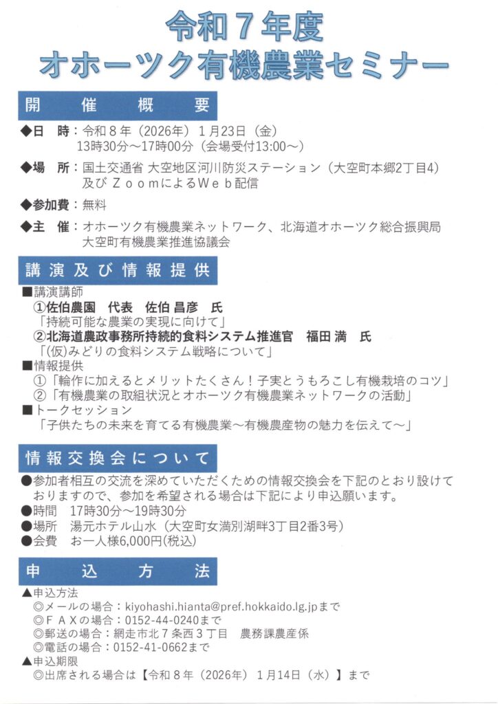 【1/23(金)大空町開催】令和7年度オホーツク有機農業セミナーのご案内