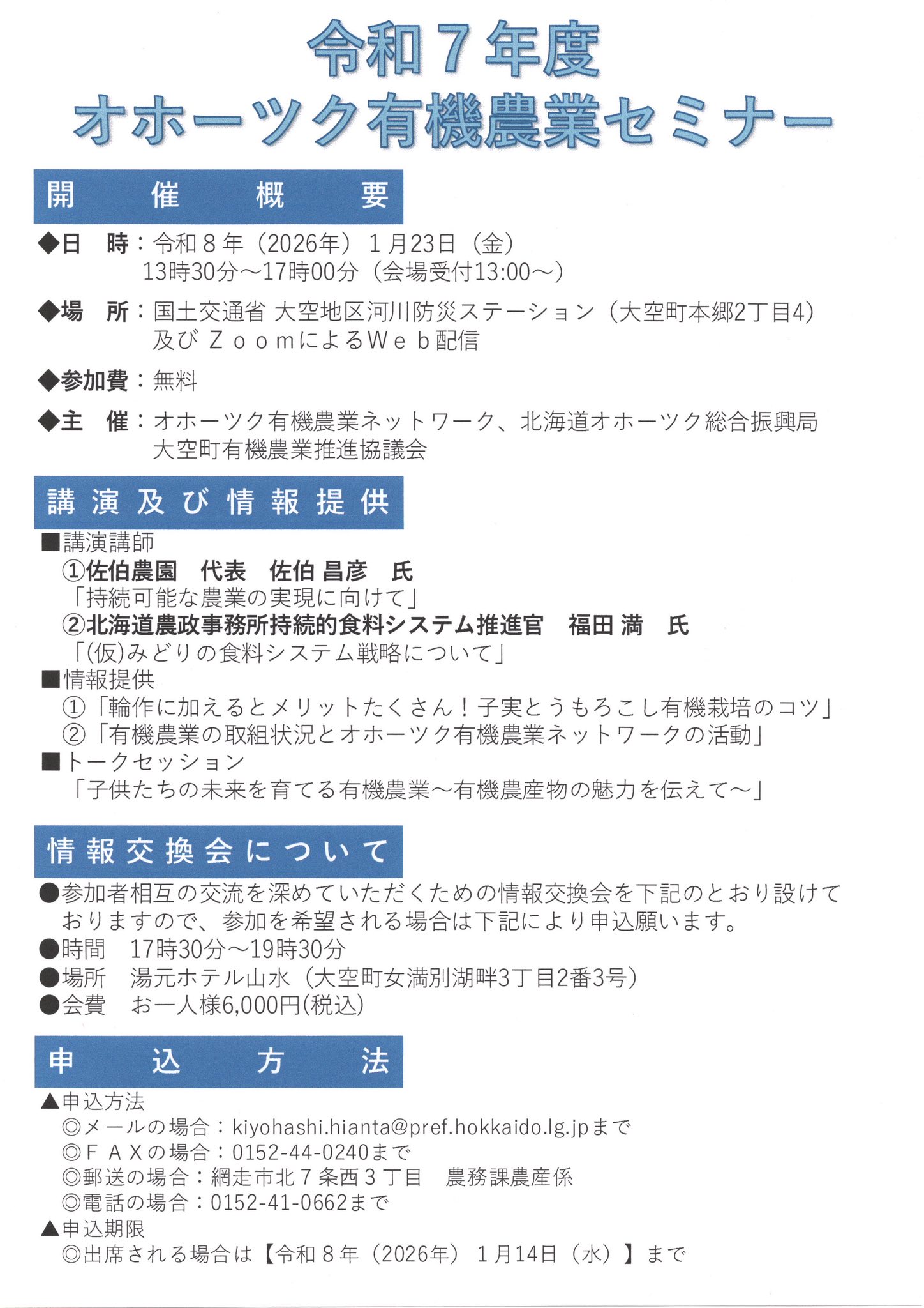 1月23日(金)、大空地区河川防災ステーションにて、「令和7年度オホーツク有機農業セミナー」を開催します。ご興味のある方はぜひご参加ください。 -